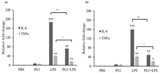 The inflammatory phase is crucial for effective wound healing [1,3]. During this phase, several immune cells, including macrophages and neutrophils, infiltrate the wound tissues and produce pro-inflammatory cytokines [42]. The attenuation of pro-inflammatory cytokines, including interleukin (IL)-6 and tumor necrosis factor alpha (TNFα), promotes cell proliferation and migration during wound healing [42,43]. Therefore, herein, we evaluated the effect of PG1 treatment on the mRNA expression of inflammatory cytokines in PG1 Tg- and wildtype-derived KCs. Cotreatment of PG1 and lipopolysaccharide (LPS) to serve as a pro-inflammatory signal resulted in a significant reduction in the mRNA expression of IL-6 and TNFα (p < 0.001) in both PG1 Tg- (Figure 6a) and wildtype-derived KCs (Figure 6b) compared to that in LPS-stimulated cells, suggesting that PG1 exerts immunomodulatory effects in addition to bactericidal effects. However, the levels of pro-inflammatory cytokines after LPS treatment were similar between PG1 Tg- and wildtype-derived KCs, suggesting that the level of PG1 expressed in PG1 Tg KCs is not sufficient to suppress the drastic increase in the expression of pro-inflammatory cytokines in response to LPS treatment.