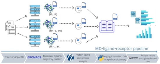 The pipeline starts by launching the command line, as shown in the GitHub tutorial https://github.com/fraMade/MD_ligand_receptor accessed on 16 April 2023 (version 1.0). For a reference to the workflow of the pipeline, see Figure 1. In particular, it takes as input the two result files of the molecular dynamics of the system: trajectory and topology (XTC, TPR) files produced with the GROMACS software. It is important for all the ligand’s atoms to belong to a single group, which has to be specified as an option in the input. The program accepts as parameters the number of parallel processes (N) and the start and end values (magnitude in ps) of the interval of the trajectory of interest. The software was developed in an HPC environment that uses Slurm as a scheduler. However, the software is also scheduler-independent and can be run on a simple server node. For further details, see the examples on the GitHub page.