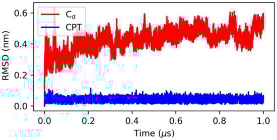 Root mean square deviation (RMSD) relative to 1 μs of simulation. The RMSD of Cα human topoisomerase 1 is shown in red, and the RMSD of compound CPT is shown in blue.