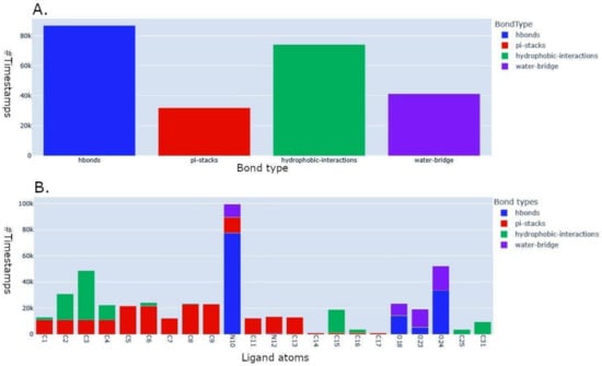 Plots of the bond types generated by the visualization tool after the analysis. (A): number of timestamps collected for each bond type. (B): detailed view showing the number of timestamps for each atom of the ligand, furtherly highlighted by bond type.
