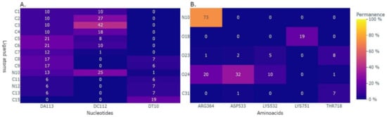 Permanence analysis among couples of ligand–receptor elements provided by the visualization tool. (A): percentage of interactions between each pair of ligand atoms and nucleotides. (B): percentage of interactions between each pair of ligand atoms and amino acids.
