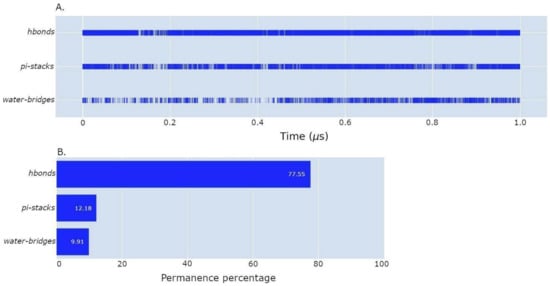 Finally, the software offers a plot of the permanence of the interaction during the trajectory, focusing on a specific ligand atom and a designated receptor nucleotide or residue (an example of this graph is shown in Figure 5A). This visualization allows users to explore the dynamics of a particular interaction of interest, providing a detailed understanding of its temporal behavior.
