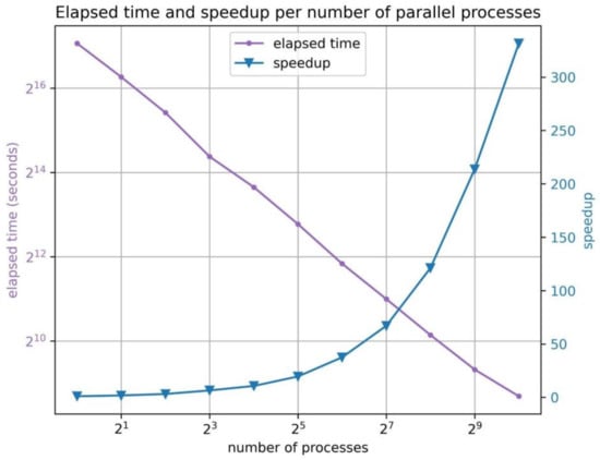 A depiction of the performance of the software. The x-axis presents the number of processes [1 → 1024] in a log scale, and the y-axis represents, on the left, the elapsed time in seconds on a log scale and, on the right, the speedup with regard to single process execution.
