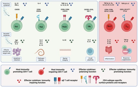 Various co-stimulatory and co-inhibitory receptors either stimulate or inhibit cellular responses of CD4+ T cells. CD4+ T cells polarize into different subsets: the main subsets in colorectal cancer are Th1, Th2, Th17, Th22, induced or natural regulatory T cells (iTregs and nTregs) and follicular helper cells (Tfh cells). Different transcription factors (e.g., T-box expressed in T cells (T-BET) specific for Th1 lymphocytes or GATA-3 specific for Th2 lymphocytes), different cytokines (e.g., interleukin 4 (IL-4) secreted by Th2 cells or IL-17 secreted by Th17 cells), specific signal transducer and activator of transcription (STAT) proteins and different chemokine receptors define these subsets [41,45]. Table 1 and Figure 2 summarize the different subsets.