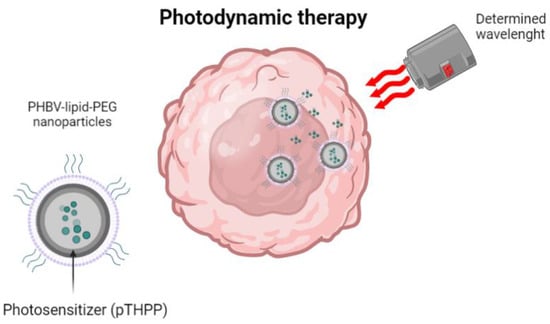 Nanoparticles have another application in the field of photodynamic therapy (PDT) for various types of cancer. In this technique, a photosensitizer (PS) is encapsulated in the nanoparticles, which can accumulate in cancerous tissues. When it is excited with a specific wavelength of light in the presence of molecular oxygen, the PS produces radical oxygen species that locally kill cancer cells. A research group used a nano-precipitation method to prepare a PHBV nanocarrier stabilizer with polyethylene glycol (PEG) lipids. These studies demonstrated the system’s efficacy for PS administration (Figure 7) []. Another research developed and characterized nanoparticles made with the same material, but in this case, functionalized with super-magnetic iron oxide nanoparticles (SPION) and loaded with the ceftiofur antibiotic. The article highlights the potential of this method to guide, concentrate, and release the active drug at a specific location []. Studies conducted previously, only with the SPION encapsulated in PHBV, have shown to be useful as contrast agents for magnetic resonance imaging and to have the potential for site-specific drug transport [].