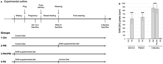 Experimental outline and SAM uptake. (a) Graphical schematic of the experimental set-up: the upper line shows the timing of the experiment and the different phases; the lower part shows the experimental groups and the diet administration. (b) [methyl-3H]-SAM uptake (cpm) was determined in total brain lysates in animals that received tritiated and non-tritiated SAM (*** p < 0.001, N = 5). Abbreviations: ED, embryonic day; PND, post-natal day; Ctrl, control diet/group; PW, post-weaning; PN, perinatal.