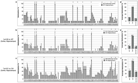 PSEN1 promoter CpG and non-CpG methylation patterns in WT and TgCRND8 mouse brains at ED14.5. (a,d) WT, Ctrl diet, N = 5; (b,e) TgCRND8, Ctrl diet, N = 10; (c,f) TgCRND8, perinatal SAM-supplemented diet (PN), N = 10. Histograms in (a–c) (left) show methylation % (±standard deviation, y-axis) of each cytosine; labels on x-axis indicate the cytosine position on the reference sequence from the 5′ (left) to the 3′ (right) of the promoter, i.e., with the region proximal to the Transcription Start Site (right). CpG cytosines are marked by a dot over the related columns. Histograms in (d–f) (right) show the average methylation % over all cytosines (±standard deviation, y-axis) as derived from the respective data and grouped as all cytosines (all-C), CpG moieties (CpG) and non-CpG moieties (non-CpG). Light grey columns represent methylation in the prefrontal cortex, dark grey columns represent methylation in the hippocampus. The level of statistical significance using contingency table analysis is shown on the left side for TgCRND8 (b,e) vs. WT and TgCRND8 supplemented diet group (c,f) vs. Ctrl group.