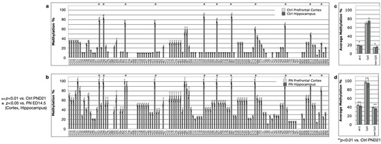 PSEN1 promoter CpG and non-CpG methylation patterns in TgCRND8 mouse brains at PND21. (a,c) Ctrl diet; (b,d) perinatal SAM-supplemented diet (PN); N = 10 per group. Histograms in (a,b) (on the left) show methylation % (±standard deviation, y-axis) of each cytosine, organized as in Figure 2. CpG cytosines are marked by a dot over the related columns. Histograms in (c,d) (on the right) show the average methylation % over all cytosines (±standard deviation, y-axis) as derived from the respective data and grouped as all cytosines (all-C), CpG moieties (CpG) and non-CpG moieties (non-CpG). Light grey columns represent methylation in the prefrontal cortex, dark grey columns represent methylation in the hippocampus. The level of statistical significance using contingency table analysis is showed on the left of the figure for TgCRND8, perinatally supplemented diet group PND21 vs. Ctrl group and vs. TgCRND8, perinatally supplemented diet group ED14.5 on the left of (b,d).