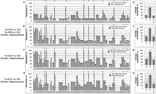 PSEN1 promoter CpG and non-CpG methylation patterns in TgCRND8 mouse brains at 3 months. (a,e) Ctrl diet; (b,f) post-weaning SAM-supplemented diet (PW); (c,g) PW + perinatal SAM-supplemented diet (PW + PN); (d,h) perinatal SAM-supplemented diet (PN); N = 10 per group. Histograms in (a–d) (on the left) show methylation % (±standard deviation, y-axis) of each cytosine, organized as in Figure 2. CpG cytosines are marked by a dot over the related columns. Histograms in (e–h) (right) show the average methylation % over all cytosines (±standard deviation, y-axis) as derived from the respective data and grouped as all cytosines (all-C), CpG moieties (CpG) and non-CpG moieties (non-CpG). Light grey columns represent methylation in the prefrontal cortex, dark grey columns represent methylation in the hippocampus. The level of statistical significance using contingency table analysis is showed for each TgCRND8 supplemented diet group vs. Ctrl group on the left of (b–h).