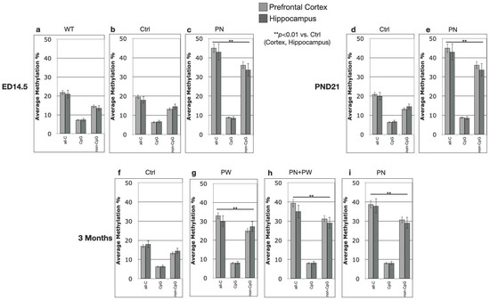 PSEN1 promoter overall methylation in TgCRND8 mouse brains. Histograms show the overall methylation % (±standard deviation, y-axis) as derived from the respective data and grouped as all cytosines (all-C), CpG moieties (CpG) and non-CpG moieties (non-CpG) over the total number of cytosines moieties. (a–c), ED14.5; (d–e) PND21; (f–i) 3 months. Light grey columns represent methylation in the prefrontal cortex, dark grey columns represent methylation in the hippocampus. The level of statistical significance for all-Cs, CpGs and non-CpGs using contingency table analysis is showed under the histograms for each group vs. Ctrl group.