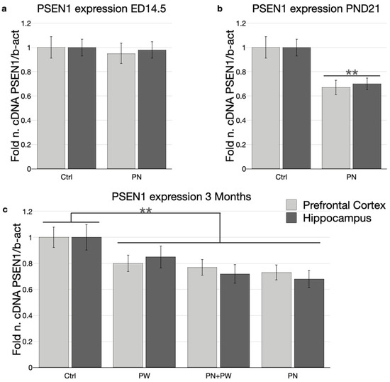 Despite the increased methylation observed (Figure 2a), PSEN1 mRNA expression at ED14.5 in PN embryos from perinatally SAM-treated mothers was comparable to that of the control (Figure 6a). On the other hand, in PND21 pups at weaning, perinatal SAM supplementation was associated with significantly (ANOVA, p < 0.01) decreased PSEN1 mRNA expression (Figure 6b). A similar significant (ANOVA, p < 0.01) down-regulation with respect to control was evident in mice at 3 months of age, independent of the type of SAM supplementation received (i.e., PN, PW and PN + PW) (Figure 6c). Unexpectedly, a trend towards increased inhibition in PN mice was seen, although these differences failed to reach statistical significance.