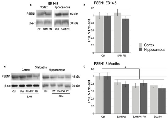 For PSEN1 protein (Figure 7), a down-regulation comparable with the change in mRNA levels was seen. Figure 7a,c, respectively, shows representative Western blot images for ED14.5 embryos and 3-month-old mice. The histograms in Figure 7b,d show the quantification of the Western blot results including replicates.