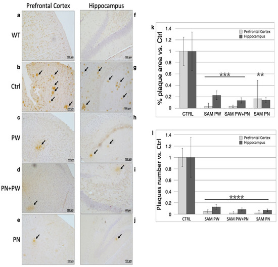 Amyloid plaque burden in TgCRND8 mouse brains at 3 months of age. From (a–j). Representative pictures of magnified 100 μm fields from the prefrontal cortex and hippocampus are shown. The left and right column pictures show, respectively, the prefrontal cortex and the hippocampus (bar = 100 μm) of (a,f) WT mice, (b,g) control TgCRND8 mice and SAM-treated TgCRND8 mice after the following treatments: (c,h) PW, (d,i) PN + PW, (e,j) PN. The histograms show the (k) % area covered by amyloid plaques and (l) plaque number in TgCRND8 mouse brains. Light grey columns represent amyloid plaques in the prefrontal cortex, dark grey columns represent amyloid plaques in the hippocampus. Abbreviations: Ctrl, control diet group; PW, post-weaning; PN, perinatal. (** p < 0.01, *** p < 0.001, **** p < 0.0001, vs. Ctrl; N = 8 per group except N = 3 for WT mice).