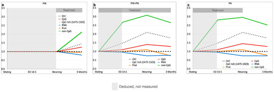 The above-mentioned data can be better discussed by observing Figure 9, which is a graphical rendering of the relative variation in DNA methylation, and PSEN1 mRNA and protein levels occurring with the three different treatments: PW (a), PN + PW (b) and PN (c). The methylation, mRNA and protein levels in control animals were used as the reference values and set equal to 1; only the line related to overall methylation is reported for convenience. The light grey areas on the left of each graph indicate the timing at which the values were not measured but “deduced” or “hypothesized” based on the first measured values (weaning for the PW group, ED14.5 for the other two groups). The dark grey boxes over the graphs indicate the timeframe of the SAM treatment. These graphs make it evident that while CpG methylation (red line) variation at the endpoint of 3 months was comparable in all the three groups, the non-CpG methylation variation was higher in the two groups receiving perinatal SAM supplementation. Specifically, non-CpG methylation was divided into the methylation levels of the CpC-rich sequence (1475–1503, dotted line) and the rest of the non-CpG moieties (green line). Also, the PN + PW group showed a final methylation variation similar to that of the PN group, despite the latter group being given SAM supplementation for a limited time in early life. Therefore, SAM treatment only affects CpG methylation to a certain extent and independently of the duration and timing of the treatment. On the other hand, non-CpG methylation had an almost 3-fold increase, and the CpC-rich stretch showed a 2-fold increase, at weaning in the PN and PN + PW groups, which then diminish slightly, compared to control. This evidence strongly supports the idea that non-CpG methylation has a functional role in modulating gene expression, as already reported by our [25,30,46,47,48] and many other studies [49,50,51]. Noteworthy, much of the evidence reporting unexpectedly high, differential, functional and dynamic non-CpG methylation were obtained from nervous tissues [52,53,54,55]. This may be not surprising since the nervous system has quite limited cell renewal abilities and that CpG methylation is maintained by DNA methyltransferase 1 (DNMT1) activity, which is dependent on the cell cycle, whereas non-CpG methylation is due to de novo DNMT3a and DNMT3b which still function in the absence of cell replication [56]. It is also interesting to note that the CpC-rich stretch at bases 1475–1503, previously identified as prone to methylation changes [25], showed methylation dynamics comparable to the overall non-CpG methylation changes (Figure 9, dotted line). A similar CpC-rich sequence was identified in the human PSEN1 5′-flanking region that shows differential methylation in control and AD patients [25]. This behavior supports this kind of CpC-rich stretch as the ideal “minimum” sequence to be analyzed to simplify the methylation assay for the possible application of PSEN1 methylation as a novel biomarker. The second CpC-rich region (1620–1726), although showing a clear difference between TgCRND8 and WT mice at ED14.5, seems less interesting as a potential biomarker since it was not differentially methylated at PND21 and 3 months and since it is a longer region (100 bp) with fewer non-CpG cytosines and also one CpG site which was always heavily methylated.