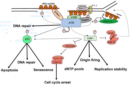 - Saldivar, J.C.; Cortez, D.; Cimprich, K.A. The essential kinase ATR: Ensuring faithful duplication of a challenging genome. Nat. Rev. Mol. Cell. Biol. 2017, 18, 622–636. [Google Scholar] [CrossRef]