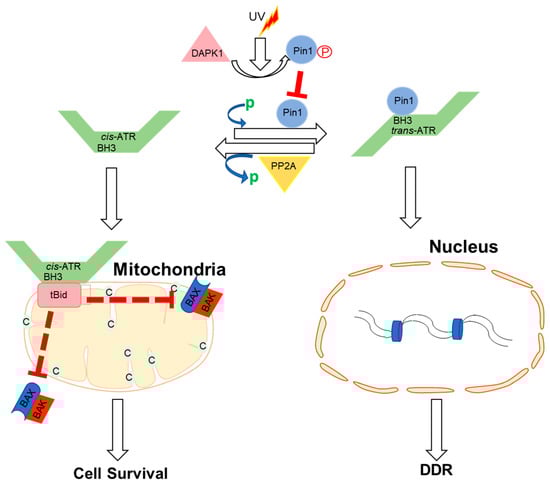 Following UV-induced DNA damage, the phosphatase PP2A dephosphorylates ATR at Ser428. Following UV irradiation, PP2A was shown to be involved in the decrease of pATR (S428) in the cytoplasm [64]. Because Pin1 function needs the Ser428–Pro429 recognition site in ATR to be phosphorylated, PP2A inhibits Pin1 activity by depleting cytoplasmic pATR at S428. Another layer of regulatory complexity to the DDR process is associated with this PP2A monitoring for ATR phosphorylation at the Pin1 motif recognition. In the event of DNA damage, PP2A interacts with ATR to dephosphorylate its Pin 1 recognition motif to prevent further isomerization of cis to trans ATR in the cytoplasm, resulting in accumulation of cis ATR-H in the cytoplasm. It was found that the accumulation of cis ATRH in the cytoplasm and mitochondria, following DNA damage, is associated with PP2A activity. Mitochondrial translocation ATR-H is an antiapoptotic protein that interacts with tBid to inhibit apoptosis activation and to reduce apoptotic cell death caused by DNA damage [64].