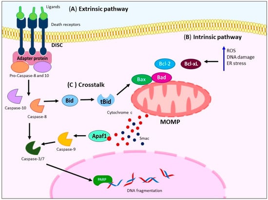 On the other hand, the intrinsic pathway is activated by various stimuli, including cytokine deprivation, reactive oxygen species (ROS) generation, DNA damage, and endoplasmic reticulum (ER) stress [20]. These triggers lead to mitochondrial outer membrane permeabilization (MOMP), which results in the release of mitochondrial proteins such as cytochrome c and Smac. The released proteins then activate initiator caspase-9 and executioner caspases-3, -6, and -7, leading to substrate cleavage, including Poly(ADP-ribose) polymerase (PARP), calcium-independent phospholipase A2 (iPLA2), and the destruction of subcellular structures [19,21]. The Bcl-2 family, comprising both pro-apoptotic (Bax and Bak) and anti-apoptotic (Bcl-2 and Bcl-xL) members, tightly regulates MOMP [22,23] (Figure 1B). Figure 1C shows that both pathways also exhibit crosstalk, with caspase-8 cleaving Bid to generate the active truncated form of Bid (tBid), which further triggers MOMP [24].