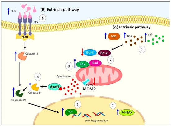 Schematic representation of apoptosis activation by ALA. (A) Several signals can trigger the activation of intrinsic pathway by ALA, for example: (1) generation of ROS, induction of SOD activity, and increase in intracellular Ca2+; (2) these signals promote mitochondrial depolarization, downregulation of antiapoptotic proteins (Bcl-xL and Bcl-2); (3) upregulation of proapoptotic proteins (Bad and Bax), VDAC, Apaf, as well as cytochrome c release; (4) proteolytic activation of caspases -9 and -3; and (5) proteolytic cleavage of PARP. (B) Regarding the extrinsic pathway, there has been reported (6) high levels of FasL, activation of caspases-8, -3, -7, and DNA damage caused by (7) p-H2A.X. ALA: Alpha-linolenic acid. ROS: Reactive oxygen species. SOD: Superoxide dismutase. Bcl-xL: B-cell lymphoma-extra-large. Bcl-2: B-cell lymphoma 2. Bad: Bcl-2 associated agonist of cell death. Bax: Bcl-2 Associated X-protein. VDAC: Voltage-dependent anion channel. PARP: Poly(ADP-ribose) polymerase. FasL: Fas ligand. DNA: Deoxyribonucleic acid. P-H2A.X: Phospho-Histone H2A.X. MOMP: Mitochondrial outer membrane permeabilization.