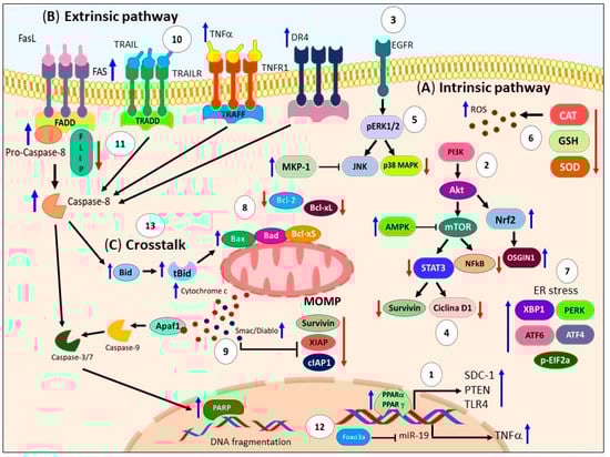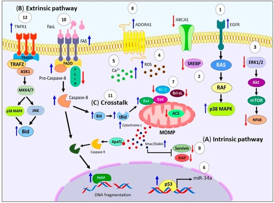 The apoptosis process is a physiological mechanism of programmed cell death. It involves two main pathways: (a) the extrinsic pathway and (b) intrinsic pathway. The extrinsic pathway is mediated by membrane cell-death receptors such as the Fas cell surface death receptor (FAS), TNF-related apoptosis-inducing ligand receptor (TRAIL-R), and TNF receptor superfamily member 1A (TNFR1). Upon binding to their ligands, these receptors recruit adapter proteins like the FAS-associated death domain protein (FADD) and TNFR-associated death domain protein (TRADD), forming the death-inducing signaling complex (DISC). The DISC facilitates the recruitment and activation of caspase-8 or -10 [18,19], (Figure 1A).