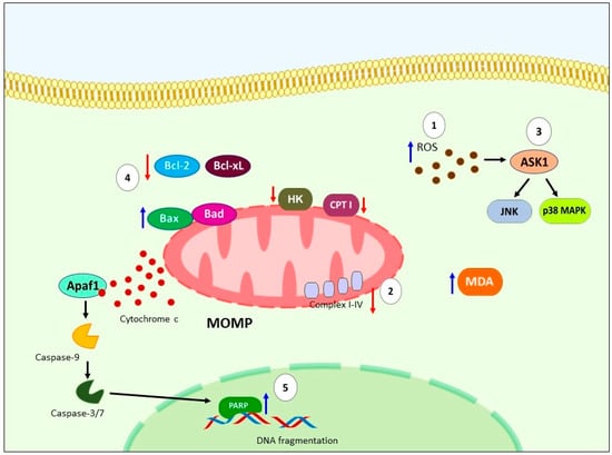 Schematic representation of molecular apoptosis pathways regulates by GLA. (1) GLA causing oxidative stress by ROS accumulation and lipid peroxidation, additionally, (2) has been report downregulation of mitochondrial CPT I, hexoquinase, and mitochondrial respiratory chain complexes I+III and IV, high levels of MDA. (3) Another mechanism reported is ROS/ASK1/JNK/p38 MAPK pathway. (4) All these events trigger intrinsic apoptosis by downregulation of Bcl-Xl, Bcl-2, upregulation of Bad, causing loss of mitochondrial membrane potential, and subsequent release of cytochrome c, activation of caspase-9 and -3, (5) leading to cleavage of PARP and DNA fragmentation. GLA: Gamma-linolenic acid. ROS: Reactive oxygen species. CPT I: carnitine palmitoyltransferase I. MDA: malondialdehyde. ASK1: Apoptosis signal-regulating kinase 1. JNK: c-Jun N-terminal kinase. P38 MAPK: p38 MAP Kinase. Bcl-Xl: B-cell lymphoma-extra-large. Bcl-2: Bad: Bcl-2 associated agonist of cell death. PARP: Poly (ADP-ribose) polymerase. DNA: Deoxyribonucleic acid.