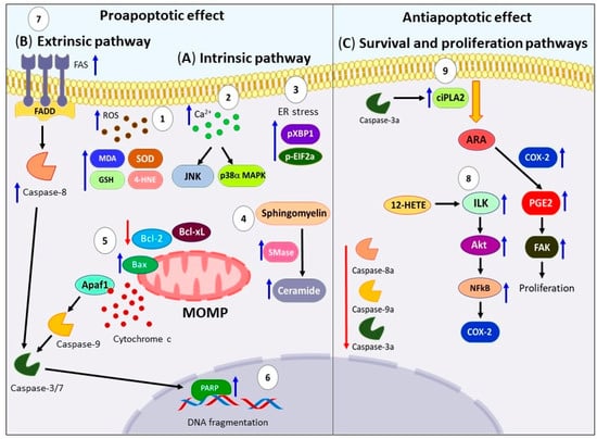 To understand this controversial effect, it is crucial to examine the molecular apoptotic pathways regulated by ARA. As shown in Figure 7A, the mechanisms proposed in the activation of apoptosis by ARA included the increased oxidative stress generated by ROS production and lipid peroxidation, high levels of MDA, 4-hydroxy-2-nonenal (4-HNE), high activity of SOD, and GSH-PX, as well as downregulation of GSH on several cancer cell lines [156,157,158,159,160]. In the same way, elevation of ROS levels and intracellular Ca2+ concentration trigger activation of p38α MAPK and JNK1 pathways on human neuroblastoma SK-N-SH cells [161]. On the other hand, Bae et al. showed that ARA increases the processed form of XBP1 (Pxbp1) and phosphorylated Eif2α (p-Eif2α) triggering ER stress on HT-29 human colon cancer cells [162]. Moreover, another mechanism reported, involves the high accumulation of unmetabolized ARA which activates the enzyme sphingomyelinase (Smase), this produces elevated ceramide levels that induces apoptosis [163]. For this reason, several studies have used inhibitors of enzymes involved in ARA metabolism such as Cpla2, COX-2, CYP4A, fatty acid coenzyme-A ligase 4 (FACL-4), coenzyme-A independent transacylase (CoA-IT), 5-LOX, leading to accumulation of intracellular ARA, elevation ceramide levels, and induction of apoptotic cell death on several cancer cell lines [164,165,166,167]. ARA mediates the mitochondria-dependent death pathway through previous stimuli, causing downregulation of Bcl-Xl and Bcl-2, as well as the loss of potential in the mitochondrial membrane, release of cytochrome c, accompanied with activation of caspase-9 and -3 that trigger the breakdown of PPAR. As well of externalization of phosphatidylserine and condensation of chromatin, on AS-30D rat hepatoma cells [168], Y79 retinoblastoma cells [160], HT-29 human colon cancer cells [162], and LoVo and RKO cells [130], among others. Furthermore, studies have reported typical morphological changes of programmed cell death such as pyknosis, karyorrhexis, cell-shrinkage and -blebbing were observed [158]. The proapoptotic effect of ARA has been supported by other experiments such as mitochondrial permeability assay, TUNEL labeling, and DNA laddering experiments [149,157].