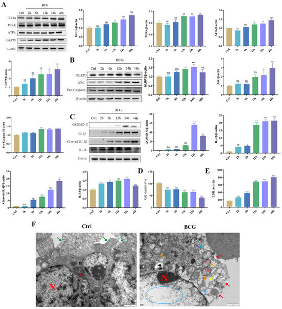 To investigate the effects of BCG infection on THP-1 macrophage ERS, NLRP3 inflammasome and pyroptosis, THP-1 macrophages were infected with BCG for 2 h, 6 h, 12 h, 24 h and 48 h. Western blotting showed that BCG infection increased the expression of ERS-related proteins (IRE1α, PERK, ATF6, GRP78 and CHOP [24]), NLRP3 inflammasome-related proteins (NLRP3, ASC and Pro-Caspase1) and pyroptosis-related proteins (GSDMD-N, IL-1β, Cleaved-IL-1β and IL-18) of THP-1 macrophages in a time-dependent manner (Figure 1A–C). TEM observation of cell morphology indicated that the cell morphology and structure in the Ctrl group were normal, the organelles in the cytoplasm were clear, and the cell membrane was intact. In the BCG group, the cell membrane was ruptured, the cytoplasmic ribosomes were significantly lost, most of the mitochondria had swollen (the cristae were broken and dissolved, the matrix was lost, they were in a flocculent structure and the mitochondria were vacuolated), and the rough endoplasmic reticulum was also expanded. (Figure 1F). CCK-8 (Figure 1D) and LDH (Figure 1E) showed that cell viability decreased with the prolongation of BCG infection time. These findings suggested that BCG infection could induce THP-1 macrophage ERS, NLRP3 inflammasome activation and pyroptosis.
