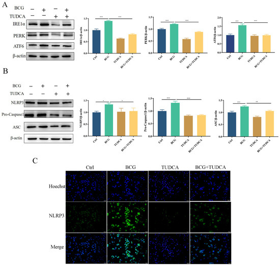 TUDCA treatment suppressed BCG-infected THP-1 macrophage ERS and NLRP3 inflammasome activation. THP-1 macrophages were pretreated for 2 h with TUDCA (5 mM) prior to BCG infection (MOI = 10) for 24 h (A). The expression of IRE1α, PERK and ATF6 was measured by Western blotting (B) The expression of NLRP3, Pro-Caspase1 and ASC was measured by western blotting. (C) Immunofluorescent staining was utilized to detect NLRP3 in these cells. Scale bar: 50 μm. Data are means ± SEM from triplicate experiments. * p < 0.05; ** p < 0.01; *** p < 0.001.