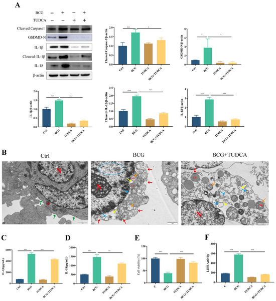 TUDCA treatment inhibited BCG-infected THP-1 macrophage pyroptosis. THP-1 macrophages were pretreated for 2 h with TUDCA (5 mM) prior to BCG infection (MOI = 10) for 24 h. (A) The expression of Cleaved Caspase1, GSDMD-N, IL-1β, Cleaved-IL-1β and IL-18 was assessed by Western blotting. (B) TEM observation of cell morphology. Scale bar: 1 μm. Nucleus (N); mitochondria (Mi); green arrows: cell membrane intact; red arrow: cell membrane rupture; yellow arrow: ribosome loss; orange arrow: mitochondrial swelling; blue arrow: rough endoplasmic reticulum expansion; blue circle: chromatin dissolution. (C,D) Cell culture supernatant IL-1β and IL-18 concentrations were detected by ELISA. (E) Cell viability in THP-1 macrophages was detected using CCK-8 kit. (F) LDH activity in THP-1 macrophages was detected using LDH kit. Data are means ± SEM from triplicate experiments. * p < 0.05; ** p < 0.01; *** p < 0.001.