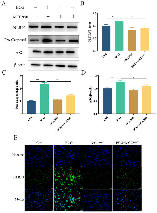MCC950 inhibited BCG-infected THP-1 macrophages NLRP3 inflammasome activation. (A–D) After pretreatment for 2 h with MCC950 (10 μM), THP-1 macrophages were infected for 24 h with BCG (MOI = 10), after which NLRP3, Pro-Caspase1 and ASC protein levels were examined by Western blotting. (E) Immunofluorescent staining was utilized to detect NLRP3 in these cells. Scale bar: 50 μm. The data are presented as means ± SEM from triplicate experiments. * p < 0.05; *** p < 0.001.