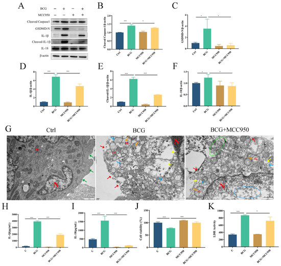 NLRP3 inflammasome-mediated pyroptosis in BCG-infected THP-1 macrophages. THP-1 macrophages were pretreated with MCC950 (10 μM) for 2 h and infected with BCG (MOI = 10) for 24 h. (A–F) The expression of Cleaved Caspase1, GSDMD-N, IL-1β, Cleaved-IL-1β and IL-18 protein levels were assessed by Western blotting (G) TEM observation of cell morphology. Scale bar: 1 μm. nucleus(N); mitochondria (Mi); green arrows: cell membrane intact; red arrow: cell membrane rupture; yellow arrow: ribosome loss; orange arrow: mitochondrial swelling; blue arrow: rough endoplasmic reticulum expansion; green circle: extravasation of cytoplasmic contents. (H,I) Cell culture supernatant IL-1β and IL-18 concentrations were detected by ELISA. (J) THP-1 macrophage viability was detected using CCK-8 kit. (K) LDH activity in THP-1 macrophages was detected using LDH kit. Data are means (±SEM) of three independent experiments. * p < 0.05; *** p < 0.001.