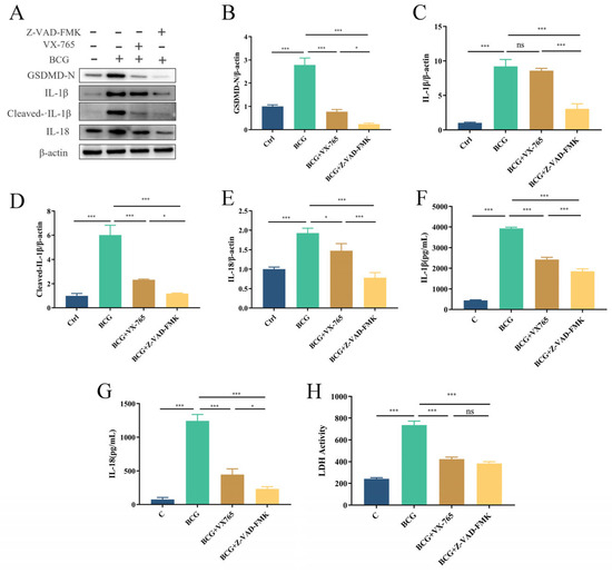 To clarify the pathway of pyroptosis in THP-1 macrophages infected with BCG, THP-1 macrophages were pretreated with the Caspase1-specific inhibitor VX-765 and the pan-Caspase inhibitor Z-VAD-FMK prior to BCG infection. Western blotting showed that GSDMD-N, IL-1β, Cleaved-IL-1β and IL-18 expression were significantly upregulated upon BCG infection, and pretreatment THP-1 macrophages with VX-765 and Z-VAD-FMK prior to BCG infection effectively suppressed pyroptosis, with Z-VAD-FMK exhibiting a greater inhibitory effect (Figure 6A–E). ELISA showed that the concentration of IL-1β and IL-18 in the cell culture supernatant was consistent with the previously mentioned findings (Figure 6F,G), and BCG-induced increases in LDH released from THP-1 macrophages were reduced in the context of such pretreatment (Figure 6H). These results suggested that BCG induces pyroptosis in THP-1 cells through canonical and noncanonical pathways.