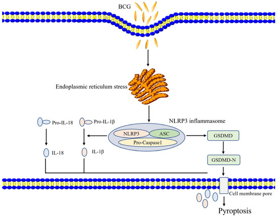 This study employed utilized corresponding inhibitors to investigate the correlation between ERS, the NLRP3 inflammasome and pyroptosis in THP-1 macrophages infected with BCG. Ultimately, these data demonstrated BCG infection to induce ERS, which in turn mediated NLRP3 inflammasome activation and pyroptosis. Additionally, the study revealed that BCG infection of THP-1 cells can trigger pyroptosis through both canonical and noncanonical pathways.