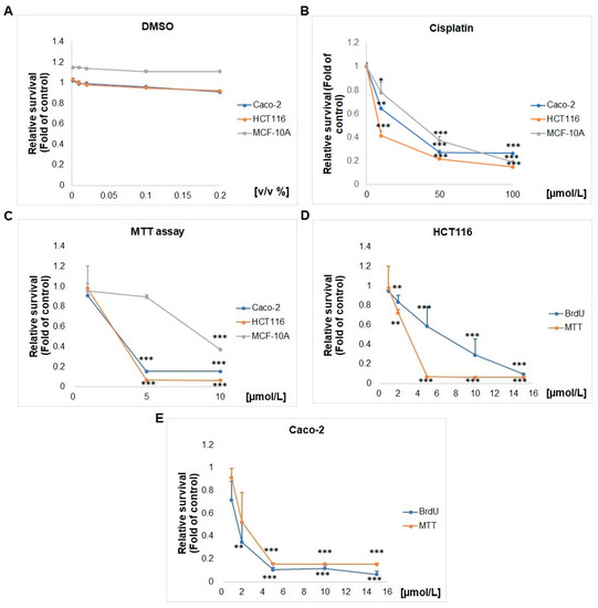 Figure 2. Effect of DMSO (A), cisplatin (B) and SS13 (CE) on the proliferation of HCT116, Caco-2 and MCF-10A cells. DMSO equivalents: 1 µM SS13 = 0.002 v/v % of DMSO; 5 µM SS13 = 0.01 v/v % of DMSO; 10 µM SS13 = 0.02 v/v % of DMSO; 50 µM SS13 = 0.1 v/v % of DMSO; 100 µM SS13 = 0.2 v/v % of DMSO. The presented data show the mean values ± standard deviation across three independent experiments. Statistical significance: * p < 0.05, ** p < 0.01, *** p < 0.001 vs. untreated cells (control).