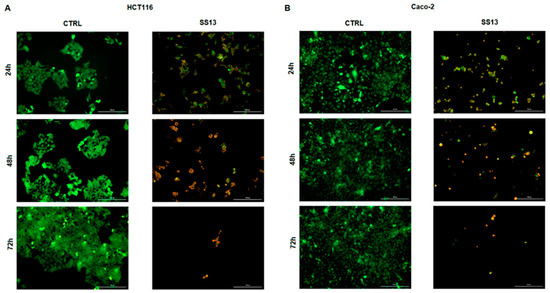 Figure 3. Fluorescence microscopic analysis of SS13-induced apoptosis in HCT116 (A) and Caco-2 (B) cell lines after 24, 48 and 72 h of treatment (7 µM for HCT116, 2.5 µM for Caco-2) using AO/PI staining. Green indicates live cells, yellow indicates cells in the early stage of apoptosis, orange indicates cells in the late stage of apoptosis and red represents dead/necrotic cells. Representative figure of three independent experiments. Magnification: 100×.
