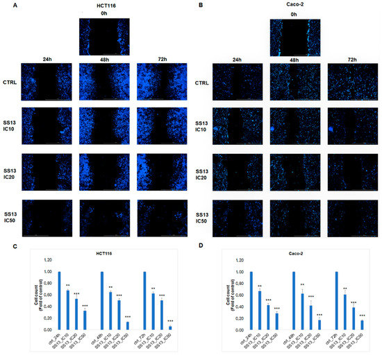 Figure 4. Scratch assay was performed on HCT116 (A) and Caco-C (B) cells treated with IC10–IC50 doses of SS13 at three different times and they were compared to untreated groups. The figures depict three independent experiments. The graph represents the number of HCT116 (C) and Caco-2 (D) cells in (A) and (B), respectively. Values represent the means ± standard deviations of three independent experiments. Statistical significance: ** p < 0.01, *** p < 0.001 vs. untreated cells (control).