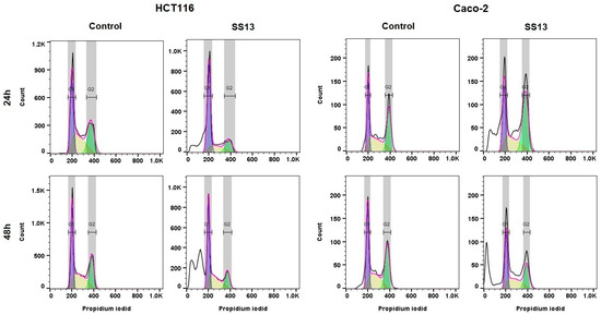 Figure 5. Representative histograms of flow cytometry cell cycle analyses of HCT116 and Caco-2 cell lines after 24 and 48 h of treatment with SS13 (7 µM for HCT116, 2.5 µM for Caco-2).