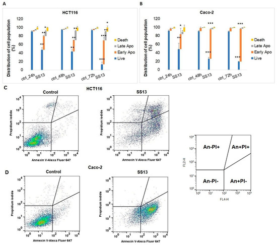 Figure 6. Annexin V/PI analysis of the incidence of apoptosis in SS13-treated HCT116 (7 µM) and Caco-2 (2.5 µM) cell populations (A,B). Representative Annexin V/PI dot plot of HCT116 (C) and Caco-2 (D) cells after 72 h of incubation with tested compound SS13. The presented data are the means ± standard deviations of three independent experiments. Statistical significance: * p < 0.05, ** p < 0.01, *** p < 0.001 vs. untreated cells (control).
