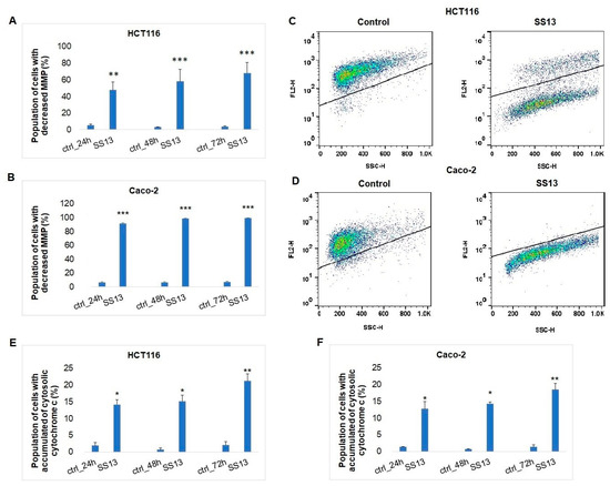 Apoptosis is a process that occurs through two main pathways, the intrinsic mitochondrial pathway and the extrinsic pathway mediated by death receptors. In the intrinsic pathway of apoptosis, the permeability of the outer mitochondrial membrane and the subsequent release of apoptogenic proteins into the cytosol increase. A key indicator of mitochondrial activity is the mitochondrial membrane potential. An MMP reduction is associated with mitochondrial damage and the release of cytochrome c from the intermembrane mitochondrial space [27]. We noticed a significant increase in the number of HCT116 (Figure 7A,C) and Caco-2 cells (Figure 7B,D) with reduced MMP in a time-dependent manner after SS13 treatment.