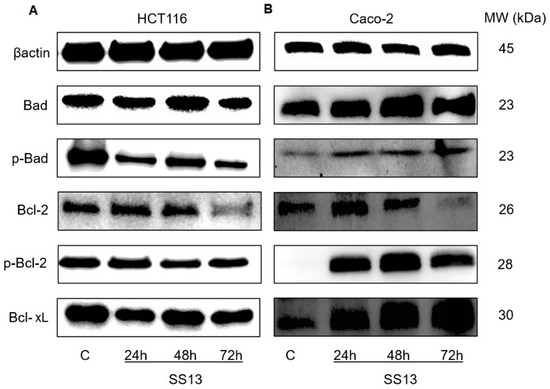 Bcl family proteins are regulators of the intracellular mechanism of apoptosis. RT-PCR analysis showed the significant upregulation of pro-apoptotic members of the Bcl-2 family. We observed a significant increase in the expression of the proapoptotic BAX gene after exposure to SS13 in both cell lines. The expression of proapoptotic BIK in the Caco-2 and HCT116 cell lines was different after incubation with SS13. In the HCT116 cell line, we first observed its downregulation after 24 and 48 h, with subsequent upregulation after 72 h. The opposite trend was noted in Caco-2 cells. First, its increased expression was observed after 24 and 48 h, followed by a significant decrease after 72 h (Table 3). Western blot analysis of the pro-apoptotic protein Bad showed an increase in total Bad in both cell lines (HCT116 only at 48 h). In the HCT116 cell line, we observed a simultaneous decrease in its phosphorylated form (pBad). Caco-2 cells did not show this phenomenon but, in contrast, we observed an increase in pBad (Figure 8). The analysis of anti-apoptotic BCL2 and BCL2L1 gene expression showed a significant reduction in both anti-apoptotic proteins in HCT116 cells after SS13 exposure (Table 3). The Western blot analysis corresponded with the data obtained by RT-PCR, and decreased levels of Bcl-xL and Bcl-2 as well as phosphorylated Bcl-2 (p-Bcl-2) were noted (Figure 8A). On the other hand, in Caco-2 cells, the significant upregulation of BCL2 and BCL2L1 expression was observed (Table 3), and the levels of Bcl-xL and p-Bcl-2 increased significantly when using the Western blot method (Figure 8B).