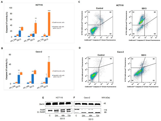 Figure 9. Effect of SS13 (7 µM for HCT116, 2.5 µM for Caco-2) on caspase-3/7 activity and PARP cleavage. Flow cytometric analysis of activated caspase-3/7 after 24, 48 and 72 h of SS13 treatment in HCT116 (A) and Caco-2 (B) cells. Representative dot plot of caspase-3/7 activation after 72 h incubation with SS13 in HCT116 (C) and Caco-2 (D), where quadrant Q3 represents apoptotic cell population with active caspase-3/7; Q1 + Q2 dead/necrotic cells; Q4 live cells. Western blot analysis of PARP after 24, 48 and 72 h of treatment with the tested compound in HCT116 (E) and Caco-2 (F) cells. The values shown are the means of three independent experiments compared to the control. Statistical significance: * p < 0.05, ** p < 0.01, *** p < 0.001 vs. untreated cells (control).