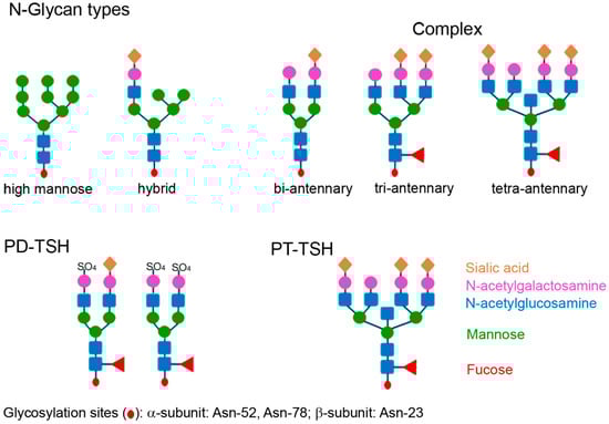 - Wide, L.; Eriksson, K. Unique Pattern of N-Glycosylation, Sialylation, and Sulfonation on TSH Molecules in Serum of Children Up to 18 Months. J. Clin. Endocrinol. Metab. 2019, 104, 4651–4659. [Google Scholar] [CrossRef] [PubMed]