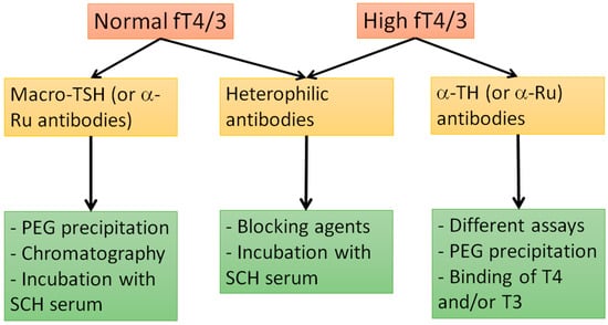 - Favresse, J.; Burlacu, M.C.; Maiter, D.; Gruson, D. Interferences With Thyroid Function Immunoassays: Clinical Implications and Detection Algorithm. Endocr. Rev. 2018, 39, 830–850. [Google Scholar] [CrossRef]