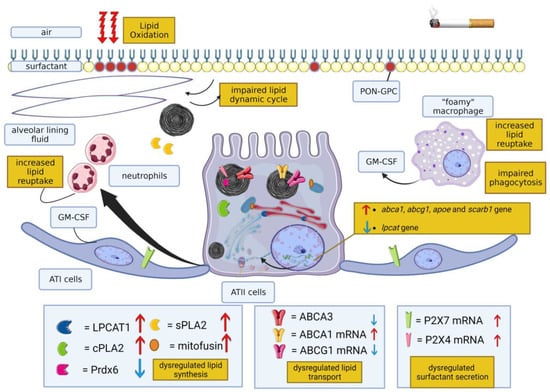 A recent multi-omics study conducted on mouse alveolar tissue was able to highlight the multiple interconnected molecular responses induced by exposure to CS: significant differential expression/abundance was found for 4324 mRNAs, 529 proteins, 173 metabolites, 43 miRNAs and 122 lipids [114]. The study, conducted on whole lung tissue, without differentiating between the numerous cell types present within the alveolar site, demonstrated that the tissue lipidomic profile changed extensively following exposure to CS, in agreement with a previous study [115]. Concerning specifically the activity of enzymes involved in surfactant metabolism, this study showed increased abundance of lysophosphatidylcholine acyltransferase 1 (LPCAT1), a multifunctional enzyme involved in the synthesis of saturated phosphatidylcholine (PC) via the remodeling of unsaturated PC (Lands cycle) in ATII cells [116], and reduced abundance of peroxiredoxin 6 (Prdx6), which acts as a calcium-independent lysosomal-type phospholipase A2 (PLA2) for surfactant lipids in MLBs, where the acidic internal pH, necessary for the basal PLA2 activity of the enzyme, is maintained [117].