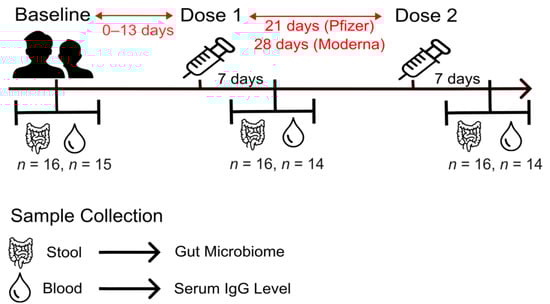Study Design. Baseline blood and stool samples were collected from study participants up to 14 days prior to their first vaccine dose. Participants received their second vaccine dose either 21 (Pfizer) or 28 (Moderna) days after the first. Follow-up stool and blood samples were collected at 7 days post-dose 1 and dose 2.