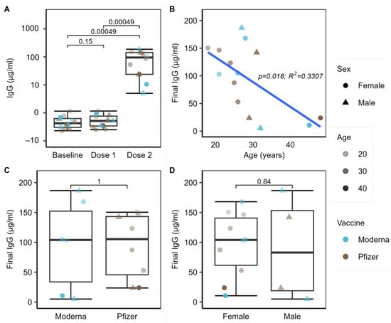 Summary of IgG responses. (A) Between baseline and dose 1 there was no significant increase in IgG (p = 0.15), however, IgG levels increased dramatically following dose 2 (p = 0.00049) (n = 15 at baseline, n = 14 at dose 1 and dose 2); (B–D) age significantly correlated with final IgG level. Among the 14 subjects for whom we obtained IgG levels post-dose 2, a significant negative linear relationship was observed between age and IgG response (p = 0.018). There were no significant IgG differences observed between the 10 male and 4 female subjects (p = 0.84) nor between subjects receiving the Moderna (n = 6) or Pfizer (n = 8) vaccines (p = 1.0). Sex is indicated by shape, vaccine manufacturer by color, and age by opacity.