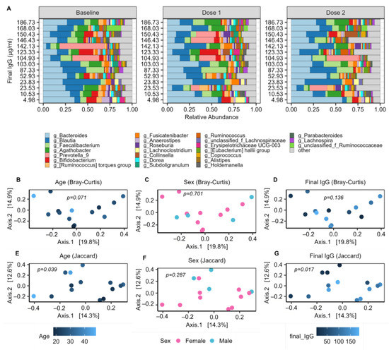 Summary of microbiome profiles. (A). Relative abundance of the top 25 genera across the 3 sampling timepoints; (B–G) PCoA plots of baseline microbiomes with colors to indicate subjects of varying age, sex, and final IgG level. PERMANOVA identified a significant relationship between the baseline microbiome and age (p = 0.039), as well as between the baseline microbiome and IgG response post-dose 2 (p = 0.017) with the Jaccard distance metric. All 16 subjects were included for analysis of relative abundance, age, and sex. IgG analysis included the 14 subjects from whom final IgG titers were obtained.