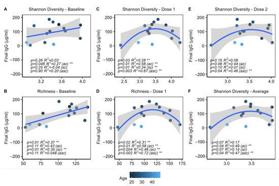 Diversity and richness are associated with IgG response. n = 14, including all subjects with final IgG titers. Linear and quadratic regressions with and without controlling age (ac), sex (sc), or age and sex (asc) as covariates. (A,B) Shannon diversity and richness at baseline (BL) showed positive linear correlations with the final IgG level. (C,D) Shannon diversity and richness after dose 1 showed significant quadratic relationships with the final IgG level. (E) Shannon diversity at dose 2 was also quadratically associated with the final IgG level. (F) The average Shannon diversity of each subject across all 3 timepoints showed a significant quadratic relationship with the final IgG. ** indicates p < 0.05.