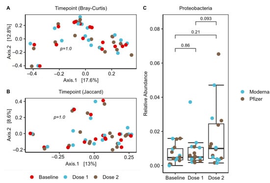 To investigate changes in the microbiome over the course of the vaccination series, PERMANOVA was performed using both Bray–Curtis and Jaccard distance metrics, with no significant differences observed by timepoint (p = 1.0). This was further visualized with PCoA plots using these distance metrics. While there was no clustering by timepoint, the three samples from each subject tend to cluster together, indicating that each subject had a unique microbiome that remained relatively consistent over the vaccination course, which was an expected finding (Figure 6A,B). To investigate any changes in differential abundance which may have occurred during vaccination, DESeq2 was performed at the ASV, genus, and phylum levels. A significant increase in Proteobacteria, a phylum known to produce immunostimulatory LPS [37], was identified in the second vaccine dose (log2 fold change = 1.24, adjusted p = 0.04) (Figure 6C). The DESeq2 finding was followed up with a paired Wilcoxon rank-sum test (p = 0.093) and visualized on a boxplot, which provided further support for a trend of heightened Proteobacteria after vaccination. No other significant findings were found, indicating that the relative abundance of most microbes, except Proteobacteria, remained relatively consistent over the vaccination course.
