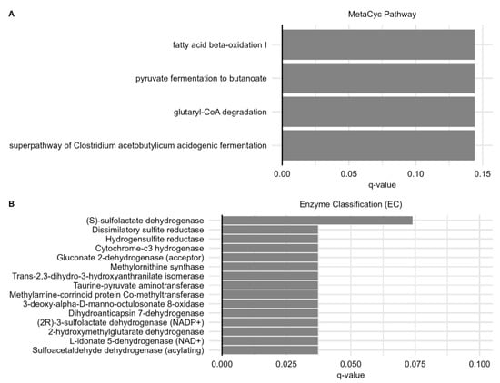 There were 144 significant (q < 0.2) baseline metabolic signatures positively correlated with IgG, including 4 metabolic pathways, 15 ECs (Figure 7), and 124 KOs (Figure S1) (Table S2). The most significant finding was a positive correlation between the KO sulfoacetaldehyde dehydrogenase and IgG response, which is consistent with the sulfate-reducing microbes Desulfobacterota and Bilophila being most strongly associated with IgG. At the EC level, a sulfoacetaldehyde dehydrogenase, two sulfolactate dehydrogenases, hydrogensulfite reductase, and dissimilatory sulfite reductase were positively associated with IgG. Additionally, many markers associated with the type-3 secretion system, flagellin, and capsular polysaccharides were positively correlated with IgG, particularly at the KO level, suggesting a possible immunostimulatory mechanism via these microbial signatures. Furthermore, several pathways related to short-chain fatty acid metabolism at baseline correlated with IgG response.