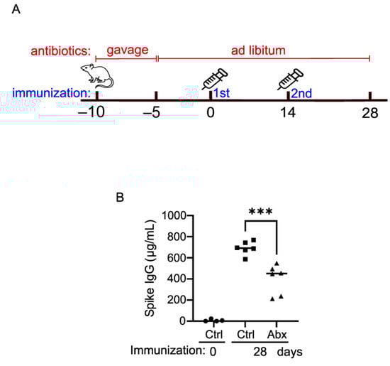 The gut microbiome contributes to optimal vaccination efficacy. (A) Timeline of antibiotic treatment and immunization; (B) concentrations of serum anti-SARS-CoV-2 spike IgG. Each dot = one animal, with squares indicating control mice and triangles indicating antibiotic-treated mice. p < 0.001 (one-way ANOVA). Ctrl: control mice treated with water instead of antibiotics in the same way. *** indicates p < 0.001.